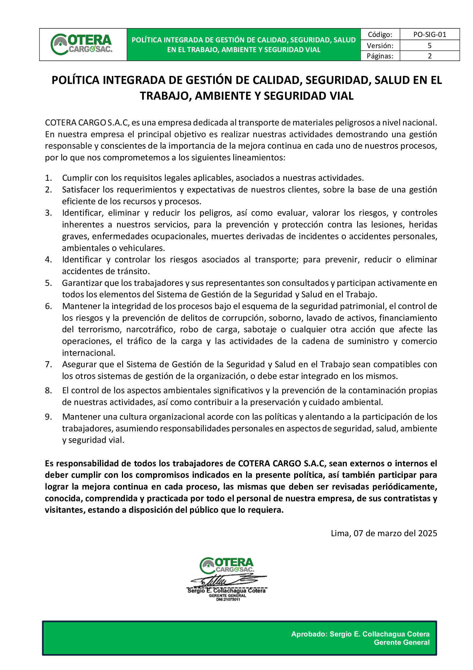 Brindar un servicio de calidad en el transporte terrestre de combustibles, contribuyendo a la competitividad de nuestros clientes con responsabilidad, seguridad, calidad, cuidado de la salud de nuestros colaboradores y del medio ambiente, fomentando el crecimiento para nuestra empresa y clientes.